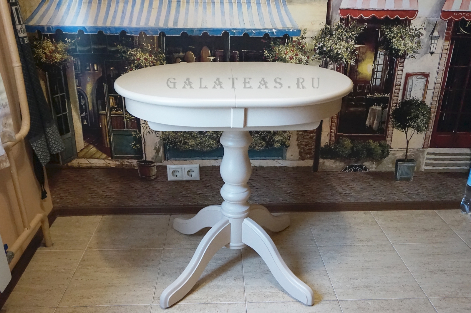 Белый нераздвижной обеденый стол на одной ножке. Стол изготавливается под заказ, поэтому можно выбрать размер и форму столешницы, а также цвет дерева. Выберите подходящий белый стол в разделе Кухонные белые столы