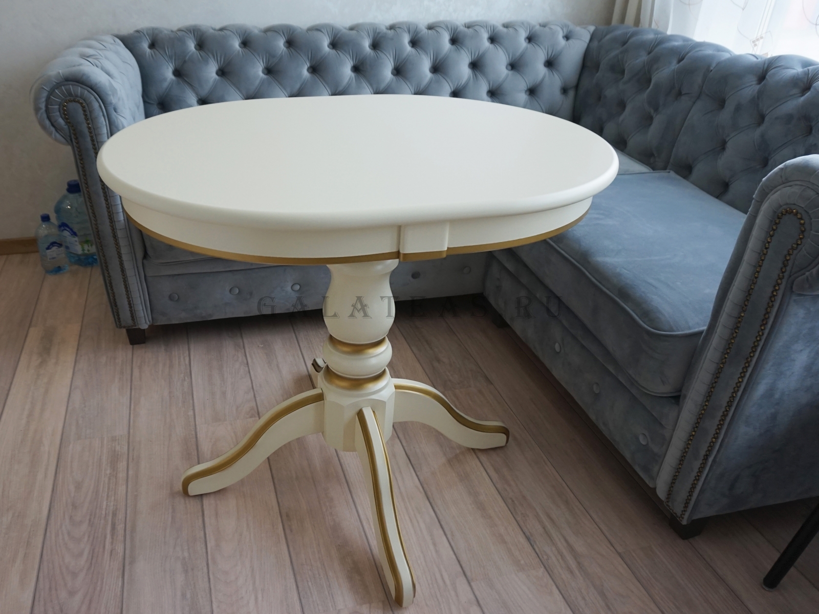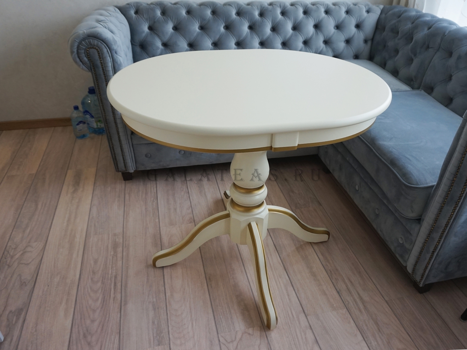 Стол Орегон, представленный на фото, имеет размер 60х80см.+вставка 20см. Материал: ножка из березы, столешница МДФ. Цвет стола белый. Стол покрыт эмалью и термостойким лаком в несколько слоев. Напыление золотом сейчас наносят несколько иначе, чем на фото: на самой столешнице напыление отсутствует, но на обкладе (под столешницей) идет напыление от нижнего края до середины обклада, по высоте. На ножку напыление наносится так, как изображено на фотографии.