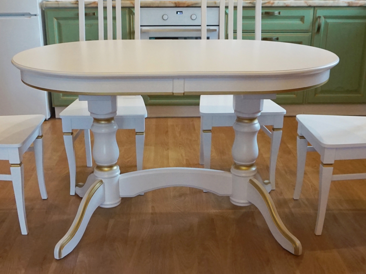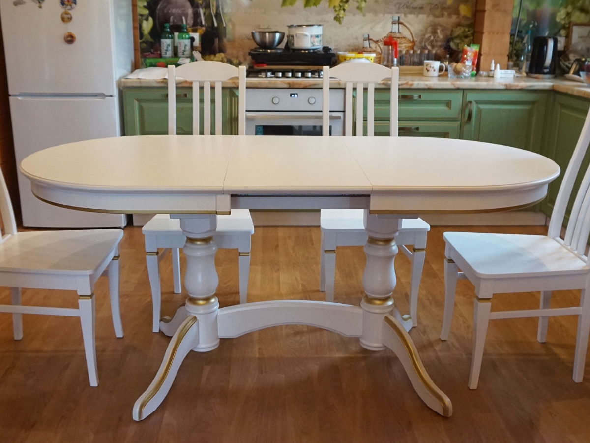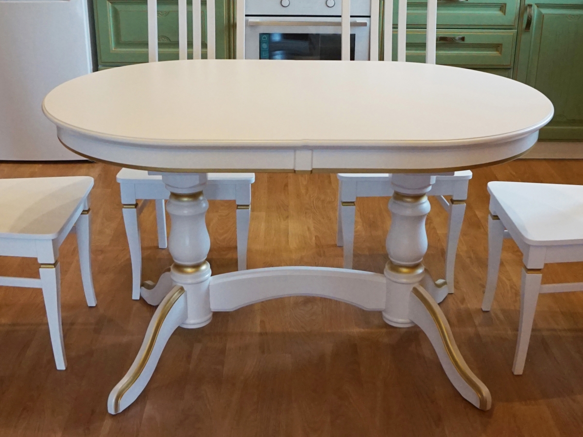 Стол Версаль Овальный 70х120 +вставка 30см. Столешница МДФ со шпоном дуба. Ножка береза. Цвет белый с золотой патиной. Скидка 30%.