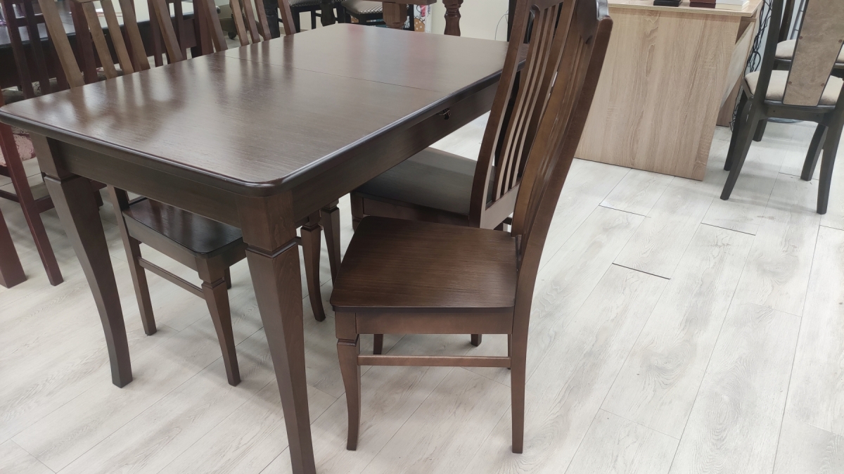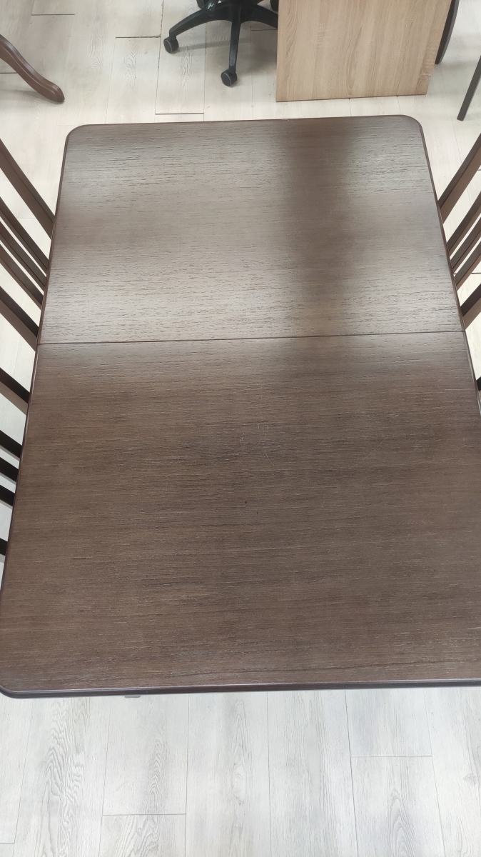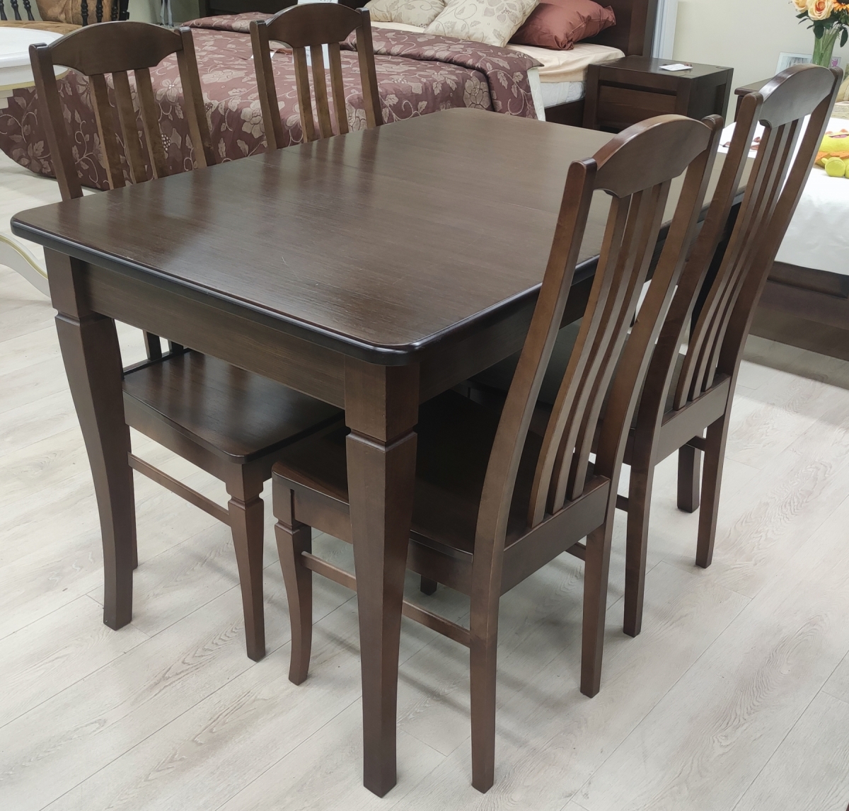Продается выставочный образец. В указанную стоимость входит стол и 4 стула. На столешнице стола есть царапины на лаке, см.фото.