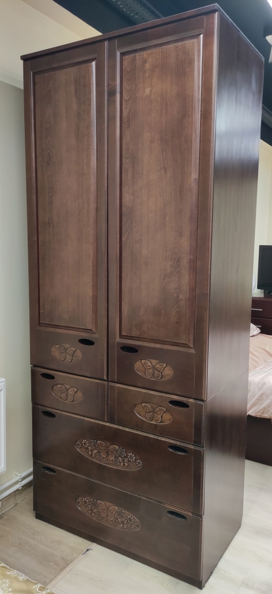 Материал: фасады массив березы, корпус из сосны, дно ящиков и задняя стенка из фанеры. Шкаф полностью из дерева, без ДСП или МДФ.